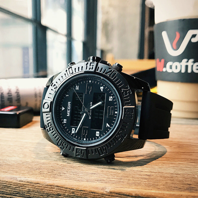 Feature: Water Resistant,LED display,Multiple Time Zone,Complete Calendar,Back Light,Week Display,Alarm,Chronograph
